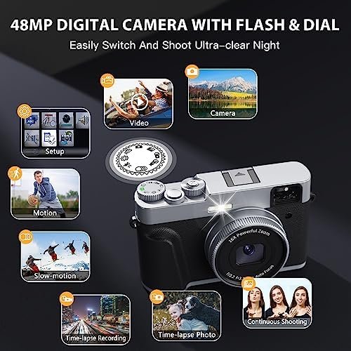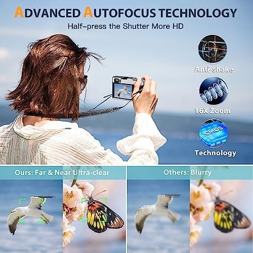 📸𝐀𝐮𝐭𝐨𝐟𝐨𝐜𝐮𝐬 & 𝐀𝐧𝐭𝐢-𝐬𝐡𝐚𝐤𝐞 𝐀𝐬𝐬𝐢𝐬𝐭𝐬 𝐒𝐮𝐩𝐞𝐫 𝐇𝐃: Say goodbye to the blur caused by other’s fixed lens! The 48MP digital camera for photography and video adds autofocus (press the shutter lightly), and the 1” close-up and long-distance can shoot HD texture blockbusters! 4K video camera for beginners(30FPS) has pause and anti-shake functions, meeting your HD needs for shooting sports, and time-lapse, timing, and slow motion, saving video production time!