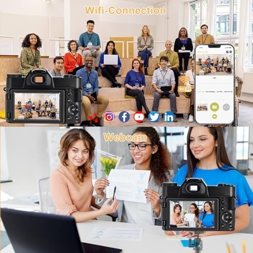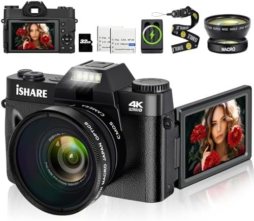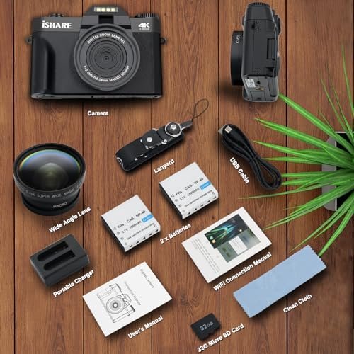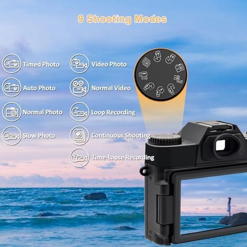 【9 Shooting Modes & 56MP Camera】This 56MP digital camera has 9 shooting modes: photo, video, auto photo, timed photo,continuous photo,slow motion shooting, Time-lapse Video, Loop Video,Video+Photo.The box Included: camera, 2 1500 mAh batteries, a 32G memory card, a portable charger (you can charge the batteries separately), a lanyard, a cleaning cloth, a usb cable
