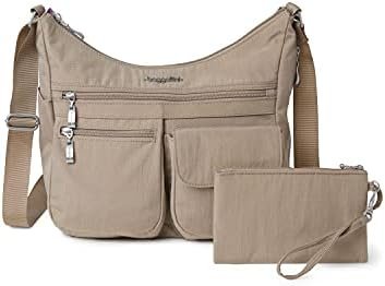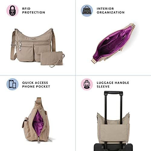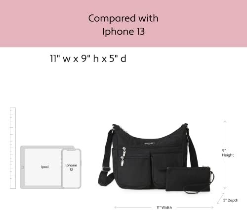 Stay comfortable and organized on-the-go with the Everywhere crossbody bag from Baggallini. Interior credit card slots and multiple pockets keep your most-used essentials ready to go, while an adjustable 52” strap helps you stay hands-free, perfect for travel, or everyday use. Inside, a removable RFID-protected phone wristlet protects your credit cards and ID from being scanned and stolen. Our water-resistant crossbody travel purse weighs just one pound and measures 9” tall, 13.5” wide, and 5” deep. And with a variety of colors and patterns to choose from, the Everywhere bag fits seamlessly into any wardrobe.