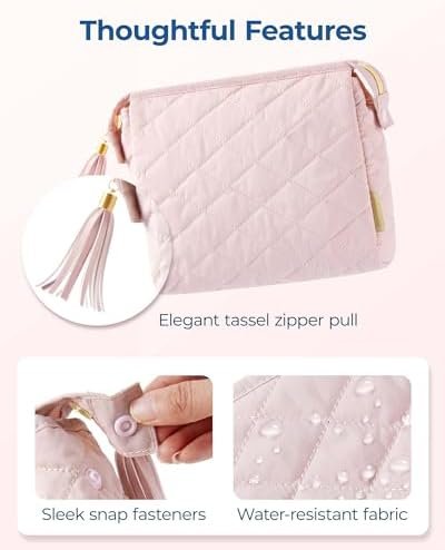 【Relaxed Elegance】- Made from soft, luxurious polyester, this delightful and puffy makeup bag adds a relaxed sophistication to your routine, allowing you to unwind during your beauty regimen. Adorned with stylish tassel zippers, secure side clasps, and smooth zipper, this cute makeup bag combines both style and practicality for your beauty essentials.