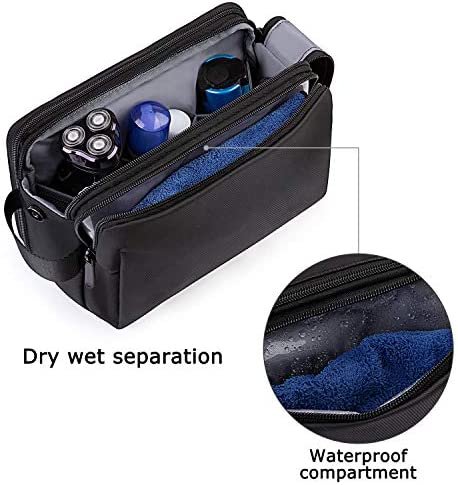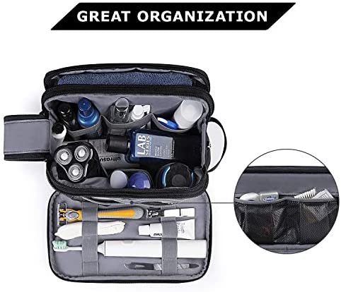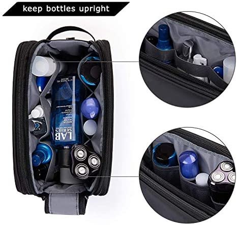 Large capacity- Spacious main compartment with elastic straps hold bottles upright. Multiple pockets inside, can hold all your toiletries and shaving supplies organized