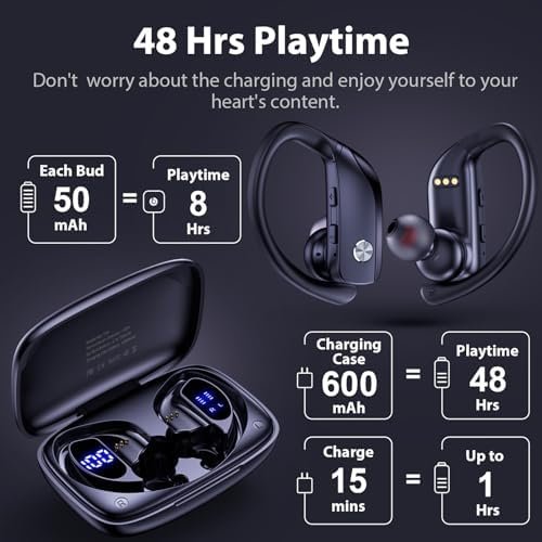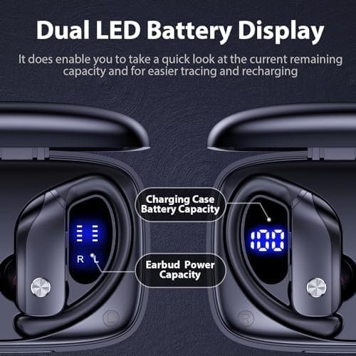 Dual LED Displays Charging Case: Wireless earbuds with LED display make it obvious to show the battery power of the case and ear buds. The remaining power in percentage on the screen is shown to the left of the bluetooth headphones. The right side is assigning to a charging process of each bud, there are separated power consumption indicators by 4 grids in total, each grid represents 25% power of bud. During Charging, the LED indicator light will flash.