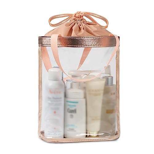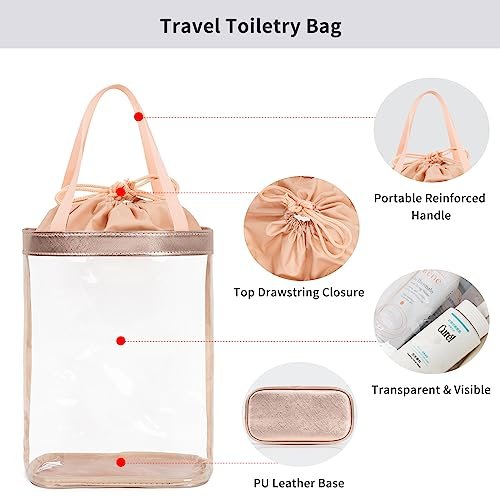 Premium Material — This clear makeup bag is made of improved thickened Eco-Friendly transparent PVC material,which is more sturdy, softer and reusable and make you find items easier. Sturdy drawstring closure on top to keep all your belongings safe.