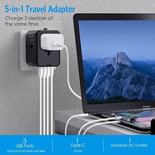 🔋【5 In 1 Power Adapter】- This universal plug integrates 3 5V/2.4A USB ports, 1 type-c port and 1 universal AC socket, which can charge 5 devices simultaneously at high speed. AC port power rating: 8A max, 100-240V (800W max at 110V, 1920W max at 240V); USB port max total power 30W.