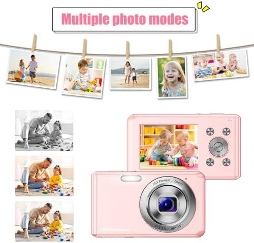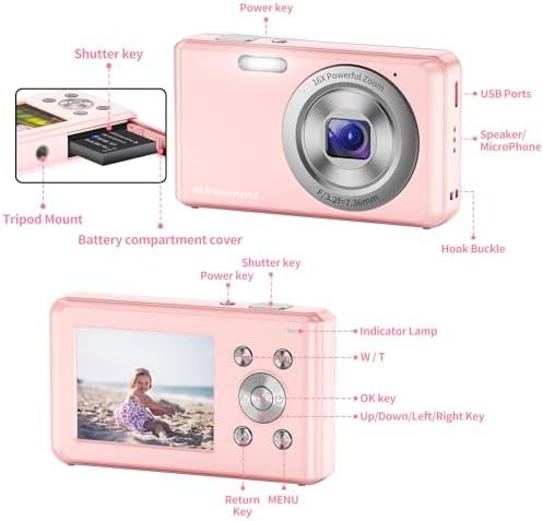 Digital Camera, HD 1080P Compact Camera with 32GB Memory Card, 48 Megapixel Camera, 2.4-inch LCD 16x Digital Zoom Digital Camera for Kids, Girls, Teens, Boys and Beginners(Pink