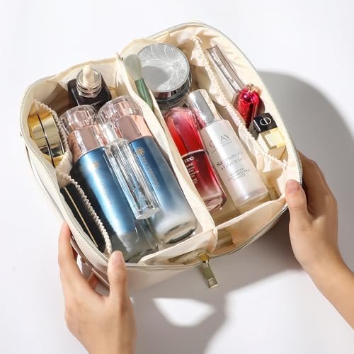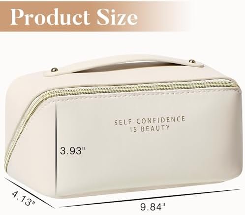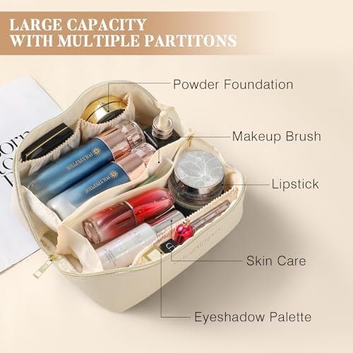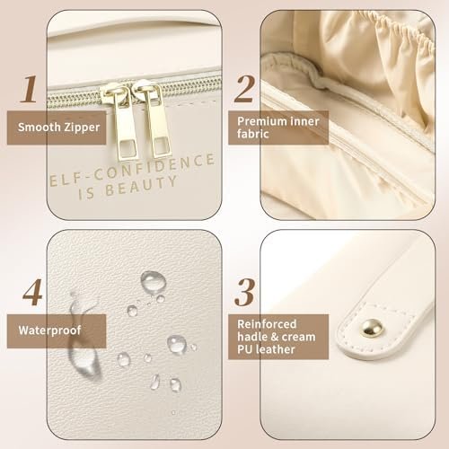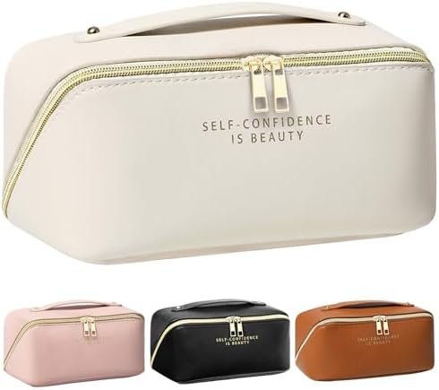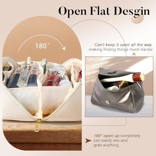Makeup Bag – Make up Bag for Women, Travel Makeup Bag with Divider and Handle, Washable Waterproof Comestic Bag PU Leather, Open Flat