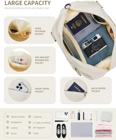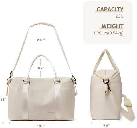 👉Large Duffle Bag: Size: 18.5x13x6.5 inch. Duffle bag for women has a large capacity and multiple compartments. Large main pocket*1, open interior pocket*2, zippered dry and wet separation pocket*1, front open pocket*1, back zipper pocket*1, trolley sleeve*1. Travel duffle bag contains your travel/gym essentials easily and orderly.