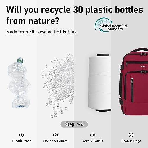 【RECYCLED PET HIGH QUALITY FABRIC】: ECOHUB carry on backpack is 100% eco-friendly because it is made from 30 PLASTIC PET bottles! Recycled fabric is water-resistant and lightweight and certified by GRS. Also built with Heavy Duty SBS brand zippers, reinforced ripstop stitching. ECOHUB travel bag guarantees the top quality.