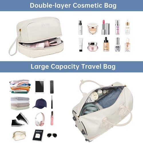 ✅【Stay Organized and Dry】: Our duffle bag for women features a roomy main compartment for your clothes and items, and a waterproof PVC lined pocket for wet clothes or towels. Plus, the extra small makeup bag keeps your essentials organized and accessible.