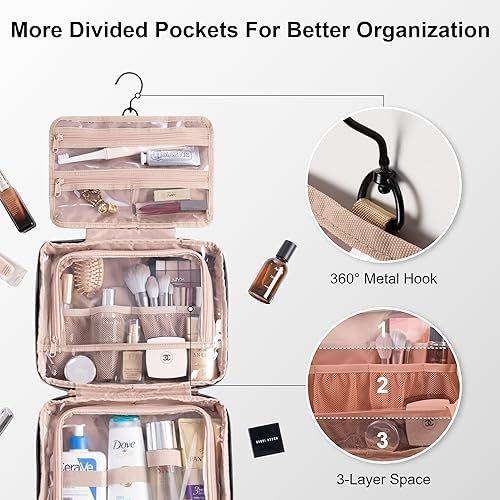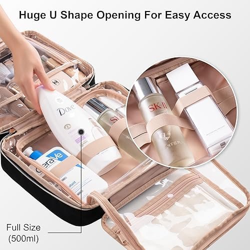 STAY ORGANIZED & EASY ACCESS – 4 main compartments including 12 pouches (more than others) classifing cosmetics and skin products, quick to reach your makeups. Putting full size shampoos(500ml) into the large full-opened (“U” type zipper) compartment with ease, the elastic bands inside keep bottles upright and prevent them from moving. Extra spacious exterior compartment is designed for large eyeshadow palette/masks.