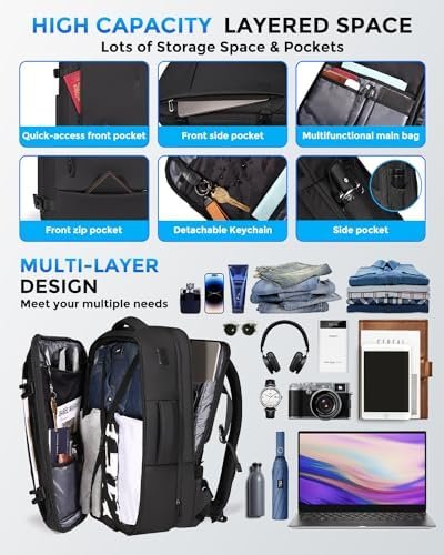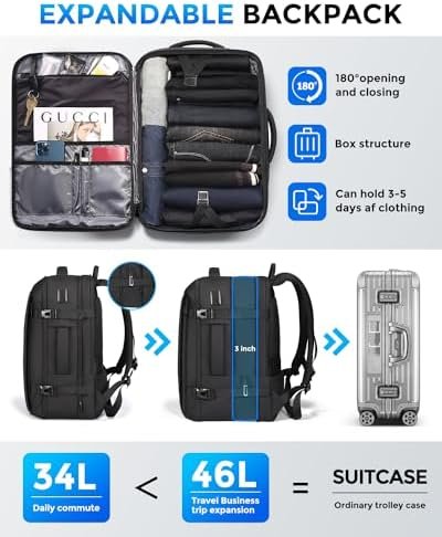 ✅【Large Capacity & Well-Organized Design】Adjustable Storage Space, before extended is 34L, dimensions: 12.6”x9”x19”; After extended is 46L, dimensions: 12.6”x12”x19”, fits 17.3 inch laptops; Weight: 3LBS. The versatile carry on backpack has a thoughtfully separated compartments and pockets offer ample room for your laptop, iPad, power bank, A4 files, wallet, cards, clothing, and more.