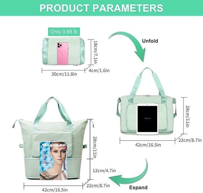 Expandable travel duffel bags provide up to 2 levels of expanded sizes to meet most weekend travel needs.The dry and wet separate pocket provides exclusive pockets for toiletries and wet towels, a good choice for sports gym tote bags.Luggage handle sleeves with zippers are a must-have feature for long-distance travel, convenient for storing mobile phones and air tickets.The waterproof Oxford fabric effectively protects the luggage to keep it dry in rainy weather.Waterproof Oxford fabric prevents sweat and rain from getting wet. Put wet towels and toiletries in a wet bag to keep other items dry.Multi-zone design can provide exclusive space for luggage. The main compartment provides effective protection for the laptop, and small luggage is placed in the exclusive compartment to keep the luggage neat and orderly.Large capacity travel bag greatly save space after folding, easily carry on your flight and travel after expansion. Great idea as an extra bag into your luggage bag. Normal Dimension: 40 x 23 x 30cm. Expansion Dimension: 40 x 23 x 45cm.