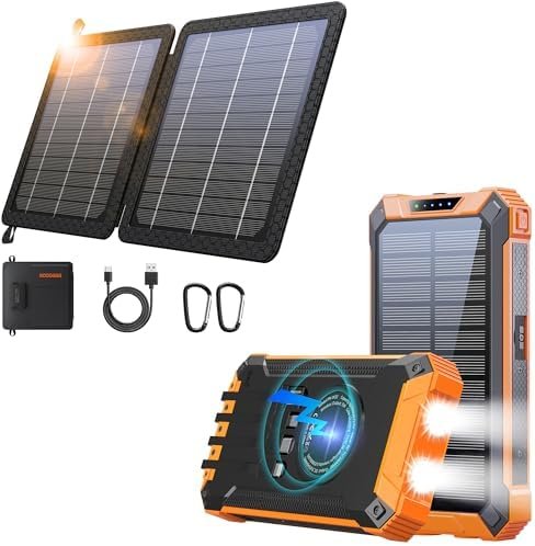 [Universal Compatibility] The solar panel has USB-A and USB-C two output ports. The solar power bank has wireless charging funtion and is built with 4 cables and 4 ports, including USB-A, USB-C, IOS and Micro USB. They can power all your devices at the same time.