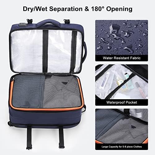 DRY/WET SEPARATION & USB CHARGING: The wet pockets of the Flight Approved Travel Backpack feature high-density waterproof material that helps you separate dry items from wet items such as wet clothes or towels. USB interface design, it is very convenient to charge your electronic devices by connecting your own power bank, so this USB backpack provides you a more convenient way to charge your phone while traveling.