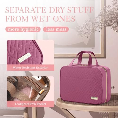 STURDY HOOK DESIGN: Featuring a premium metal hook, the HOTOR cosmetic travel bag offers the convenience of hanging from a towel rack, coat hook, or any available space. This not only showcases your toiletries and cosmetics for easy accessibility but also saves valuable bathroom counter space. The sturdy metal hook is designed with a retractable feature, allowing it to be neatly stowed away when not in use.