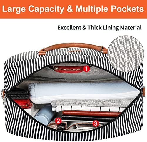 Size of Weekender Bag for Women: 21″L×13″H×9.5″W, Messenger Bag: 10″L×9″W, Storage Bag: 7″L×4.5″W, 2 Adjustable straps up to: 49″-54″. The weekender duffle bag can hold necessities for 2-4 days, a largest 21.5″ laptop, clothes, pants, footwear, cosmetics, toiletries, electronic equipment, etc.
