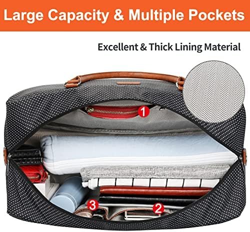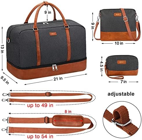 Size of Weekender Bag for Women: 21″L×13″H×9.5″W, Messenger Bag: 10″L×9″W, Storage Bag: 7″L×4.5″W, 2 Adjustable straps up to: 49″-54″. The weekender duffle bag can hold necessities for 2-4 days, a largest 21.5″ laptop, clothes, pants, footwear, cosmetics, toiletries, electronic equipment, etc.