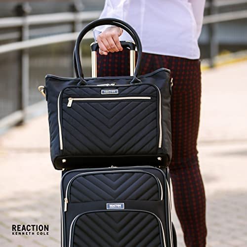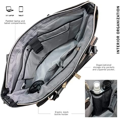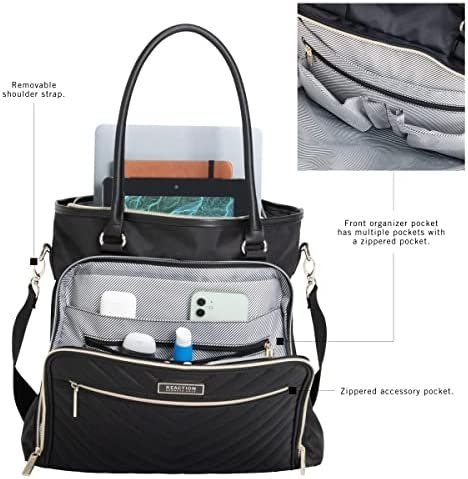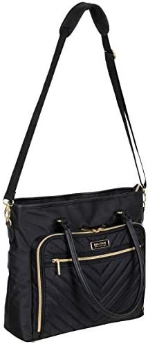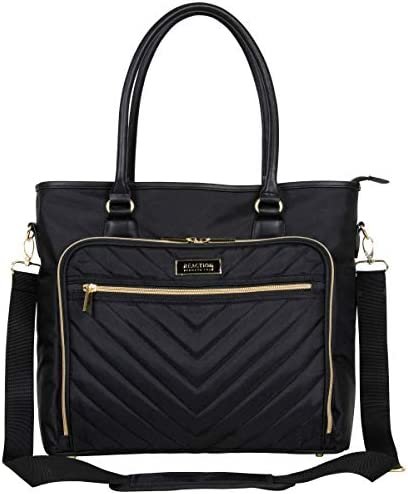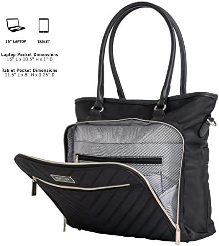 A must-have tote, fashionable enough for everyday use. The stylish, polyester twill exterior with chevron quilted detail and a tear-resistant, fully-lined interior and sturdy construction with a large single compartment and eye-catching, distinctive gold hardware make this bag great for business and travel alike. The laptop pocket is padded to fit most laptops with up to a 15-inch screen, and a separate padded tablet pocket fits most tablets. The front exterior has an easy-access zipper pocket for frequently needed items. A zip around front organization compartment with an open Slip Pocket and zippered pockets holds all of your business essentials. The main compartment includes a padded tablet pocket, laptop pocket, and zipper pocket, while still leaving plenty of room to store other needed belongings. The rear exterior features a trolley strap to fit over most luggage trolley handles for hands-free carrying, and tote style handles made to be worn over the shoulder allow an 8.5-Inch handle drop. Another carrying option is the removable, adjustable, padded shoulder strap that extends to be 52 inches long. Perfect tote for work, school, college, as a gift, for valentine’s day or Mother’s Day, or to hold all your needed belongings on your commute to work. A straightforward and stylish tote, great for business, travel, or everyday use. ★ Overall Dimensions: 17” L x 13” H x 5” D. ★ Laptop pocket Dimensions: 15” L x 10.5” H x 1.0” D. ★ Weight: 2.15 lbs. ★