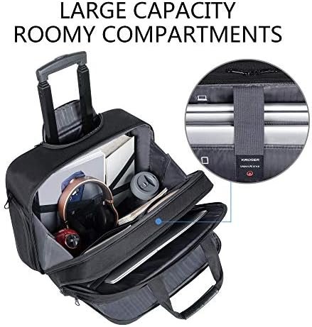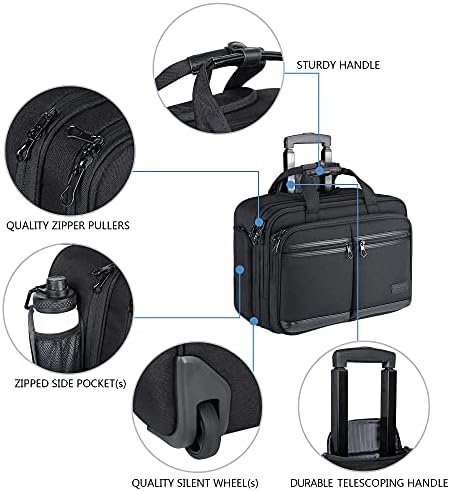 The Rolling laptop bag is made of durable and high-quality water-repellent Fabric. Dimensions: 18.1″x 14.2″x 9″; Weight: 6.33 LBS. Maximum length of the telescoping handle: 21.7 inch.