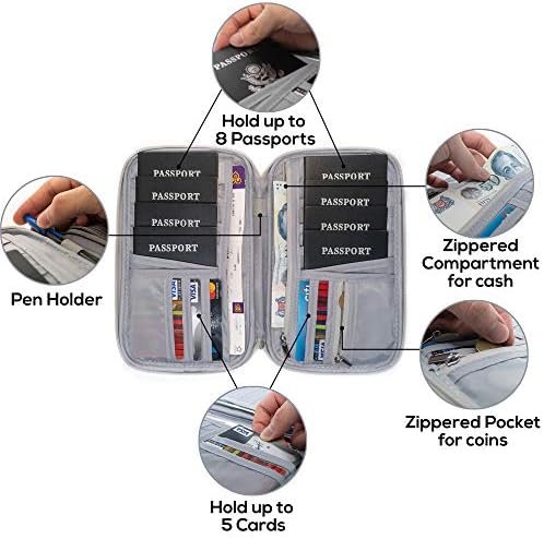 PERFECT FOR GROUP TRAVELS WITH FAMILY AND FRIENDS – Able to fit up to 8 multiple (32 PAGES) passports , you can use it as a family passport holder for 5, 6 and 8 ! It also serves as a travel document organizer that can hold tickets, 4-10+ cards, documents , cash and coins compactly in one wallet , without having to worry about it being too bulky . COMES WITH BONUS ADD-ON GIFT : 3 credit card and 5 large passport RFID-Blocking sleeves ( Used when cards and passport are not inside the wallet)