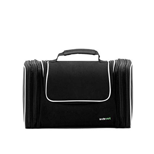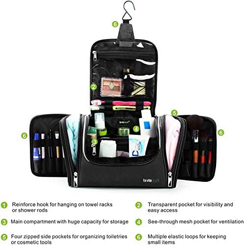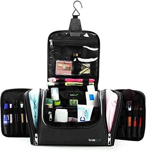 Reinforced hook and carrying handle allow to be hung up on towel rack, shower rod, or door handles conveniently. With secure zipper closure, your items will be organized well and protected safely. With Lavievert’s toiletry kit, you are always ready to go and to look your best.