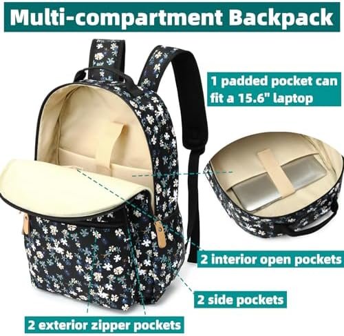 Organized & Large capacity: Main compartments with double-zipper closure; 2 exterior zipper pockets; Water-bottle pockets on both sides; 1 padded pocket (Can fit 15.6 inch laptop); 2 interior open pockets; 2 interior zipper pockets; 1 thickened back pocket.