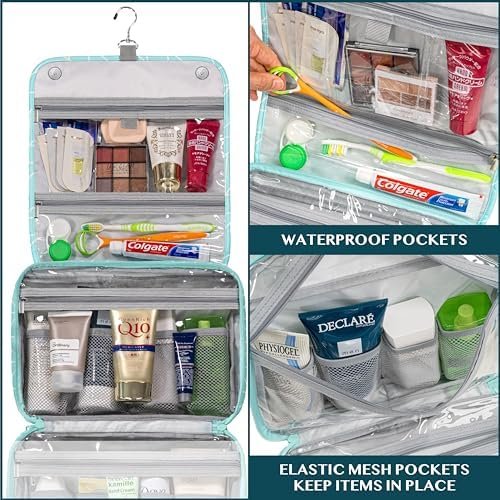 COSMETICS TRAVEL BAG ORGANIZER: This toiletry bag for women has a hanging hook and multiple pockets that help you stay organizer during business trip, vacation travel. The hanging hook makes it easy to hang the toiletry bag to bars in the hotel shower bathroom. Unzip your toiletry bag to reveal compartments to organize your shampoo, skincare face hygiene products. This toiletry travel bag is an essential accessory for cruise in Europe, plane, Hawaii Trip, and honeymoon.
