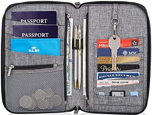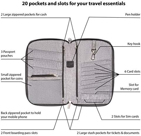 IT WILL ALLOW YOU TO EASILY PLACE ALL YOUR TRAVEL ESSENTIALS IN ONE WALLET. 3 big passport pouches(you can put passport In cover), 2 front pockets for boarding passes, 2 zippered big pockets for cash, 2 hidden pockets for documents, roomy external zippered phone pocket, 2 SIM card pockets, pocket for memory card? Key hook… Totally 20 pockets and slots