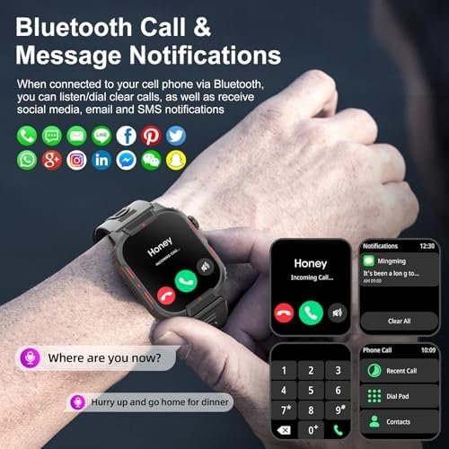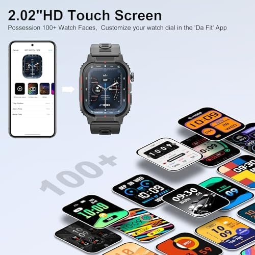 【Rugged Military Smart Watch】This military smart watch for men is equipped with a 2.02″ high-definition large screen with a resolution of 320*385, providing you with a comfortable viewing and touching experience. It has a rich built-in user interface. The “Da Fit” application has up to 300 watch faces for you to choose from. You can also upload your favorite photos. The diverse watch faces can better show your personalization and uniqueness.