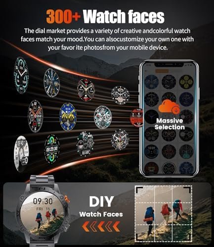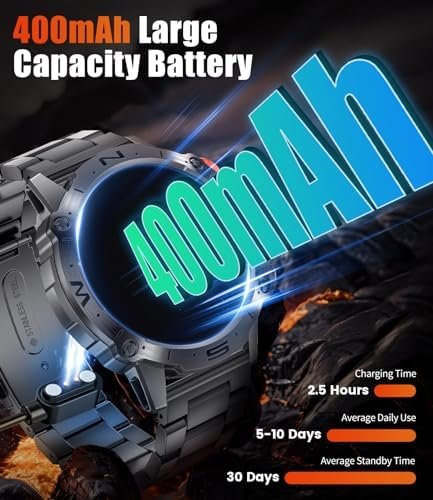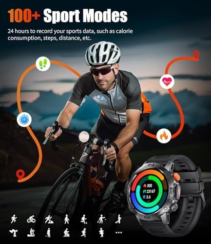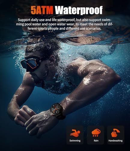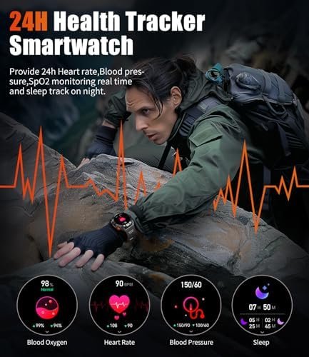 🏄♂️【5ATM Waterproof&Military Quality】This rugged military smart watches for men has undergone a number of rigorous military-grade tests, including extreme temperatures, low air pressure, drilling, crushing, hot steam exposure, etc., to ensure reliability in extreme environments. With Mohs 9H tempered glass, military watch is hard enough to withstand a range of screen breakage possibilities. Featuring a fully enclosed metal body casing and a 5ATM waterproof rating, it’s the perfect companion whether you’re braving the great outdoors or conquering the urban jungle.