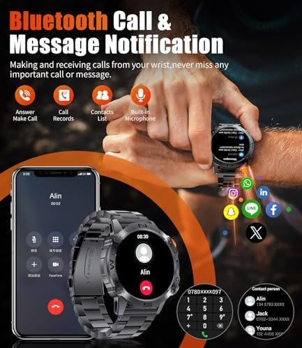 📞【Bluetooth Calling & Message Notification】Featuring Bluetooth 5.0 to provide a stable connection, the mens smart watch is equipped with a 60dB speaker and noise-cancelling microphone for unrivalled call clarity.When you can’t access your mobile phone, you can answer/dial calls directly through your waterproof smartwatch, and you can hang up at any time when you don’t have to deal with timely or inconvenient calls.The smartwatch for men also allows you to stay connected with messages from apps like SMS, Facebook, WhatsApp, Instagram, Twitter, Tiktok, Skype, etc. without worrying about missing any important message.