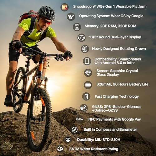 【Flagship Model, Upgraded Premium Design】Featuring a stylish and functional 1.43-inch OLED screen (466*466 high-resolution) with auto-adjustable brightness and Sapphire Crystal Glass. The interchangeable 24mm strap is made of durable and sweat-proof Fluororubber material. New reinforced bezel carvings ensure durability in any environment, with US Military Standard 810H certification. Customize the dual display with colorful backlight and choose from over 7,000 watch face designs through the TimeShow app. Personalize your style and enhance your journey with this durable and stylish smartwatch.