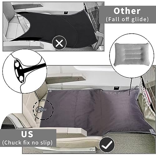 𝗘𝗮𝘀𝘆 𝘁𝗼 𝗨𝘀𝗲 & 𝗡𝗼 𝗚𝗹𝗶𝗱𝗲: One side attaches to the back seat, and hang the other side on the tray table armrest in front of the seat, like kids hanging bed airplane, were able to turn a very comfortable airplane kids bed to lie flat and play. An inflatable pillow can put inside in toddler airplane bed to make the airplane foot rest for kids more comfortable. A chuck on the airplane baby bed can be fixed inside the seat gap to prevent the plane foot rest for kids from sliding.