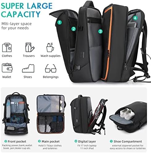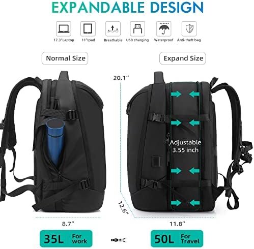 [36L-50L EXPANDABLE DESIGN]: The extra large carry on backpack with expandable feature gives you a spacious capacity experience. Normal state is 36L, dimensions are 20.1×12.6×8.7inch. after extended is 50L, dimensions are 20.1×12.6×11.8inch. You can expand the zipper and buckles according to your requirement
