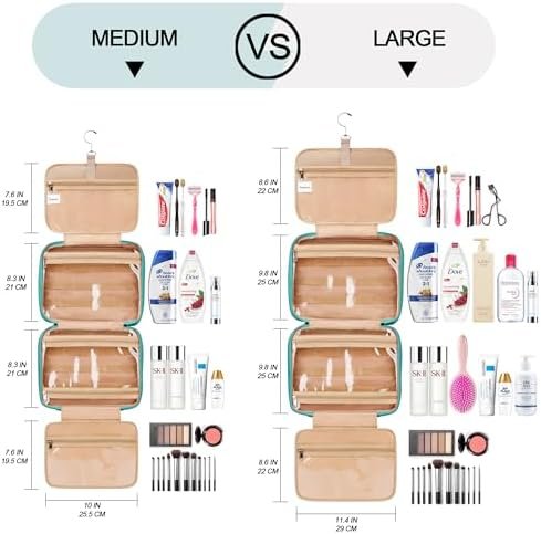 CONSIDERABLE DESIGN – The elastic bands inside the two main compartments can keep the different height bottles fixed and upright. Your comb, toothbrush, razor, and leak-prone makeup can all go in there, even a hair dryer. 360° metal hook gives you a variety of hanging options.