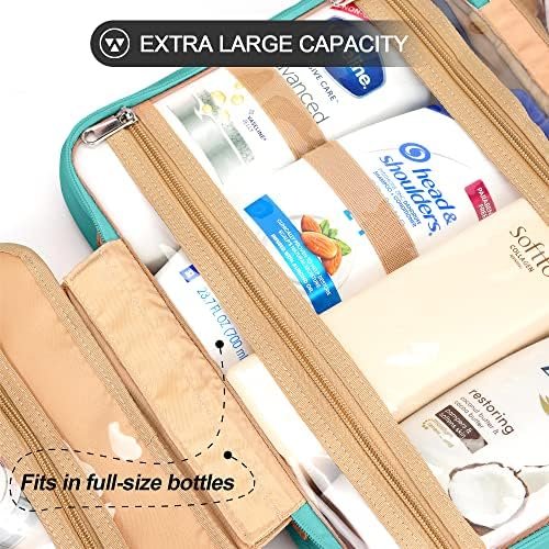 PATENT PENDING GREAT ORGANIZER MASTER – This wash bag is designed with 4 toiletry storage compartments and a special jewelry compartment; you can easily put your wash products and jewelry separately to make your journey organized. The size of the fully-loaded state is 12.5”L x 10”H x 4.5”W, the 2 main compartments can hold up to 8 full-sized toiletries and cosmetics at the same time, no worries for long-distance travel.