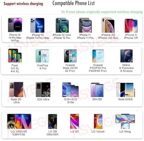 Such as this wireless charging Compatible with iPhone 14/14 Pro Max/14 Plus/iPhone 11/11 Pro ; Compatible with Samsung Galaxy Note 20 Ultra/S9+/S9;Compatible with LGG7/LG Velvet;Compatible with Huawei Mate 20/30/40 Pro+;Compatible with OnePlus 8 Pro,etc