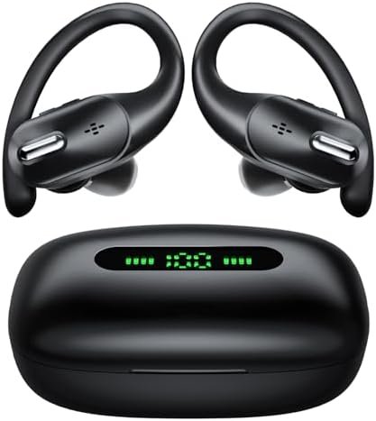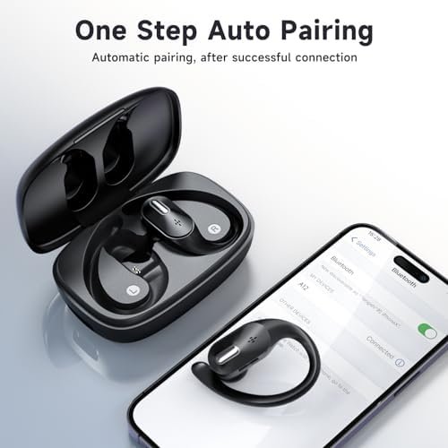【Ergonomic Design for sport& IPX 5 WaterProof】:The A12 wireless headphones feature an ergonomic design with comfortable and soft ear hooks, ensuring a secure fit during sports activities without falling off. Additionally, multiple sizes of ear tips (S/M/L) are provided for you to choose from, offering a better wearing experience according to your preferences. Constructed with IPX5 waterproof material, these bluetooth earbuds allow you to exercise without worrying about sweat entering the earbuds.