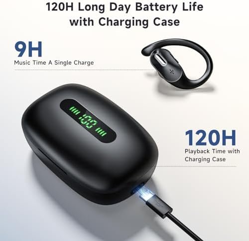 【120H Standby Time &Emergency Power】:Wireless Bluetooth earbuds with a charging case have a playback time of up to 120 hours, and a single full charge of the wireless headphones allows for 9 hours of playback. The ultra large capacity 1200mAh charging case of the Bluetooth wireless headphones can serve as an emergency power source for your phone, helping you provide emergency power to your phone.In addition,The charging case supports USB C charging.